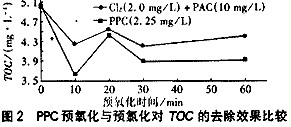 PPC預氧(yang)化與預氯化對(dui)TOC的(de)去除效果見圖2。