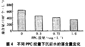 圖(tu)4表(biao)明PPC預氧化具有較(jiao)好的(de)(de)除藻(zao)(zao)效能,且隨著PPC藥(yao)劑(ji)投量(liang)的(de)(de)增加、沉后(hou)水藻(zao)(zao)含(han)量(liang)逐漸下降,當PPC投量(liang)增加到1.0mg/L時(shi),沉后(hou)水藻(zao)(zao)含(han)量(liang)降為335×104個/L,比常規混凝處理下降了(le)46.4%。