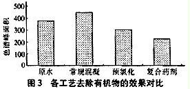試驗比較了PPC預處理工(gong)藝(yi)(yi)、常規工(gong)藝(yi)(yi)、預氯(lv)化(hua)加粉末活性炭工(gong)藝(yi)(yi)(以下簡(jian)稱(cheng)Cl2+PAC工(gong)藝(yi)(yi))的除有機污(wu)染物(wu)效能。