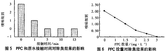 PPC投量及(ji)接觸時(shi)間對嗅味去除效(xiao)果的影響見圖5、6。
