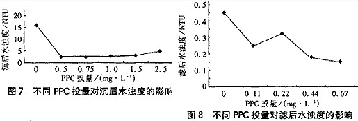 由圖7、8的試驗結果可(ke)見,投(tou)加(jia)不同量的PPC藥劑(ji)均(jun)可(ke)取(qu)得較好的助凝和助濾(lv)效(xiao)果,較單(dan)純用聚合鋁(lv)處理的沉后水濁(zhuo)度(du)降(jiang)低了68.7%~85%、濾(lv)后水濁(zhuo)度(du)降(jiang)低了20.5%~54.5%。同時發(fa)現PPC投(tou)量<0.5mg/L時,沉后水的濁(zhuo)度(du)隨(sui)PPC投(tou)量增加(jia)而降(jiang)低,而投(tou)量>0.75mg/L時濁(zhuo)度(du)隨(sui)PPC投(tou)量增加(jia)而上升(sheng)。