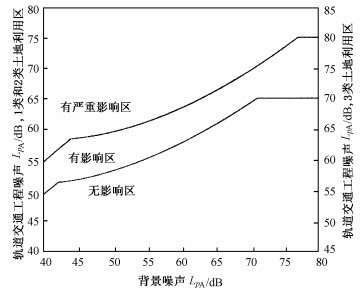 圖1中有2條曲線,每條曲線均由3部分組成,起始部分軌道交通噪聲隨背景噪聲線性遞增;中間部分軌道交通噪聲隨背景噪聲以3次多項式遞增;最后部分與背景噪聲無關,是軌道交通自身噪聲的最高限值。圖1中2條曲線構成了3個噪聲影響評價判別區,在低位曲線以下區域,表明軌道交通噪聲對周圍土地使用功能無影響,因為,從平均意義上講,由于軌道交通噪聲的加入而增加的噪聲煩惱人群的比例尚未突破低位曲線設定的比例;在低位曲線與高位曲線之間的區域,表明軌道交通噪聲對周圍土地使用功能有影響,即由于軌道交通噪聲的加入而增加的噪聲煩惱人群的比例突破了低位曲線設定的比例,但尚未突破高位曲線設定的比例,通俗地講,由軌道交通噪聲而使環境噪聲的增加已有較多公眾覺察,也有一定比例的人群感到煩惱,但尚未使公眾感到強烈反感;在高位曲線以上區域,表明軌道交通噪聲對周圍土地使用功能有嚴重影響,即由于軌道交通噪聲的加入而增加的噪聲煩惱人群的比例突破了高位曲線設定的比例,已使公眾感到強烈反感。
