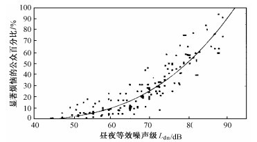 美國環境保護局于20世紀70年代進行了大量的社區公眾對噪聲的反應度的調查研究,其結果被美國聯邦噪聲問題協調委員會、美國住房和城市開發部、美國標準協會和國際聲學界廣泛認可。根據美國環保局的調查研究結果,交通噪聲是公眾最反感的,公眾對交通噪聲的劑量反應關系被TheodoreJ.Schultz綜合整理于圖2,即Schultz曲線。近年來,又對鐵路噪聲、軌道交通噪聲、街道交通噪聲作了補充調查研究,Schultz曲線形狀得到了進一步確認。