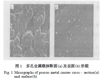 采用掃描電鏡對所制備的多孔金屬載體表面及斷面形貌進行了觀察,如圖1 所示。由圖1 可見,制備的氧化鋁膜附著于基體內孔壁上(圖 1a) ,納米尺度的溶膠粒子在表面上復合(圖1b) 大大提高了基體的比表面積。