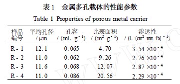 金屬多孔催化載體材料的性能對于催化劑的負載及催化活性的優劣起著決定性作用,表1 列出了多孔金屬載體的比表面積、平均孔徑、滲透性等相關參數。從中可見,不同工藝參數制備的樣品性能有所不同。樣品R - 4 既具有較高的比表面積與孔容,又具有一定的滲透性,可以作為多孔催化過濾基體材料。