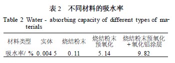 根據浸漬法的典型工藝流程,在采用浸漬法擔載催化劑時,首先應配制一定濃度的浸漬溶液。而浸漬溶液濃度及浸漬方式的確定,則主要取決于催化劑載體材料的吸水率大小。本課題采用稱重法,測試了316L 不銹鋼實體、燒結粉末材料及其預氧化基體材料以及催化劑載體材料的吸水率,結果如表2 所示。