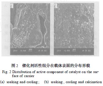 由圖2a 可以看出,多孔催化載體經多次浸漬、干燥后,其表面吸附了一些NH4VO3 ,但此時的NH4VO3 顆粒粗大,容易發生聚集,因此分布不很均勻。而將浸漬、干燥后的載體試樣再進行焙燒(圖2b) ,NH4VO3 分解為細小的V2O5 顆粒, 均勻彌散地分布在多孔催化載體表面,具有很高的催化活性。