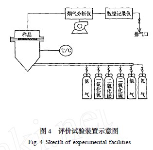 整個實驗系統由3 大部分組成: (1) 配氣系統,目的是配制出滿足實驗要求的含有不同組成的混合氣體; (2) 反應和控制系統,包括控制反應的溫度; (3) 分析系統,采用HORIBA PG - 405 型氣體濃度分析儀,分析混合氣體進出口的NO、 O2 、CO2 和SO2 的濃度。評價實驗裝置示意圖見圖4 。