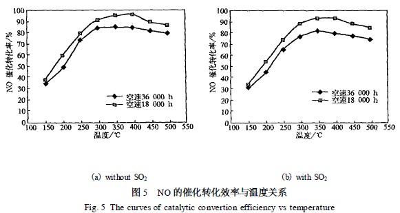通過實驗,得到了在不同空速、有無SO2 條件下的NO 轉化率與溫度的關系曲線,如圖5a 與圖5b 所示。