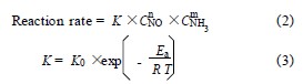 圖5a 與圖5b 均表明,在相同空速條件下,隨著溫度的增加,催化轉化率提高;在相同溫度下,隨著空速的增加,催化轉化率下降。如果NH3 催化還原脫除NO 的反應速率用下面的一般反應方程式表示: