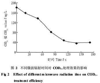 由圖2可以看出,不同的微波輻射時間對電鍍廢水的處理有明顯的效 果,隨著時間的增加,其去除率逐漸增加,在140 s時CODCr 濃度值降低到最低點,隨后下降趨勢不明顯。其去除率最大 可以達到78.0%。對曲線進行一次方程模擬,結果為: