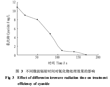 式中,y為氰化物濃度; x為微波輻射時間。 由上式可以看出,氰化物的去除率與微波輻射時間呈線性相關。