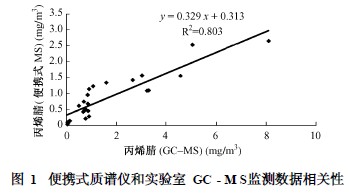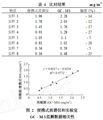 在(zai)丙(bing)烯腈泄漏(lou)事故現場(chang),用(yong)便攜式質譜儀在(zai)現場(chang)連續監(jian)(jian)測,同時采用(yong)蘇碼罐采樣后用(yong)實驗室 GC - MS分析。表4為對應的比(bi)對結果,圖2為兩臺儀器(qi)監(jian)(jian)測數據的相關圖。