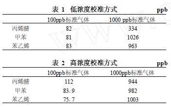 為了考察不同濃度(du)(du)校準(zhun)方(fang)式對(dui)測(ce)定結果(guo)(guo)的(de)(de)影(ying)響, 分別使用高濃度(du)(du)( 1000ppb ) 和低濃度(du)(du) (100ppb) )的(de)(de)丙烯腈、甲苯和苯乙烯的(de)(de)混合物標(biao)氣對(dui)儀器校準(zhun)后, 再對(dui)這兩(liang)個(ge)標(biao)樣進行分析。表1和表2分別為100、1000ppb標(biao)準(zhun)校準(zhun)后再次分析的(de)(de)結果(guo)(guo)。