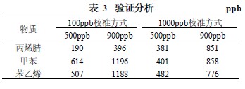 配(pei)制500ppb和900ppb的丙烯腈、甲苯、苯乙烯混合標(biao)氣(qi)樣(yang)品(pin)兩(liang)個(ge),再次分(fen)別用100ppb和1000ppb 兩(liang)種校準方式進行驗(yan)證分(fen)析,結果如(ru)表3。