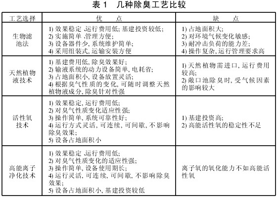 實踐表明,生物氧化技術、天然植物液除臭技術、活性氧化技術、高能離子空氣凈化技術四種除臭工藝除臭效果均較好,均能達到環評要求的排放指標。除高能離子凈化技術除臭在國內工程實例報道較少外,其余幾種均有工程實踐,如采用A/O(缺氧/好氧)生物工藝的武漢市漢西污水處理廠,用生物氧化技術中的土壤法除臭;采用CAST工藝的大連老虎灘污水處理廠,用活性氧技術除臭;采用A2/O工藝的桐鄉市城市污水處理廠,用天然植物液技術除臭。此外高能離子凈化技術除臭在法國、英國、蘇格蘭、瑞典等國均有很多應用實例,2007年重慶巫山污水處理廠采用了高能離子除臭技術。綜合比較四種除臭工藝優缺點見表1。桐鄉市城市污水廠綜合分析以上四種除臭工藝的優缺點,認為天然植物液技術基建投資小,操作簡單,除臭效果好,運行靈活。隨著藥液國產化,污染源加蓋處理,缺點可以克服。因此桐鄉市城市污水處理廠除臭工藝選擇天然植物液技術。