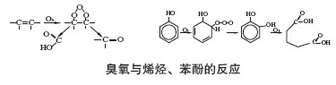 臭氧對水中有機物的氧化過程可分為直接氧化和間接氧化,直接氧化是臭氧與水中有機物直接反應生成羧酸等簡單有機物或直接氧化生成二氧化碳和水的過程,這類反應一般發生在溶液呈酸性(尤其是pH<4)的反應體系,或溶液中存在大量碳酸鹽等自由基反應鏈終止劑的反應體系。在直接氧化反應的條件下,臭氧與含有雙鍵等不飽和化合物以及帶有供電子取代基(酚羥基)的芳香族化合物反應速度較快,屬于傳質控制的化學反應,臭氧與烯烴或苯酚的反應即屬此類,其反應機理見圖示;但是,飽和的有機物及酚羥基以外的其它有機物與臭氧的直接反應速度卻很慢,屬于由反應速度控制的化學反應。
