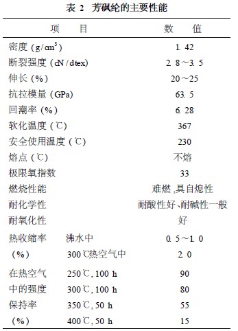 芳砜綸的主要性能列于表2。從表2 中可看到,芳砜綸是制作袋式除塵器配套濾袋的優良材料,不僅耐熱性良好,而且還具有優良的抗熱氧老化的穩定性,熱收縮小,能保持良好的尺寸穩定性以及良好的抗酸性能等,可在高溫下長期使用,非常適用于耐高溫濾料,價格相對P84、PPS、Nomex也較便宜。另外,芳砜綸的纖維摩擦系數小,用其制成的濾袋清灰容易;由于芳砜綸耐溫較高,因此可與PTFE (固化溫度260℃)熱壓粘合制成過濾效果好且穩定的覆膜濾料。