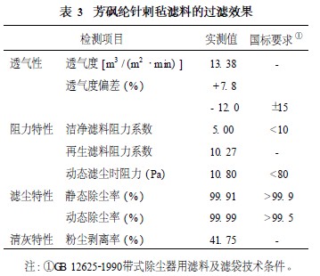表3是采用2 dtex ×51 mm芳砜綸短纖維制成的針刺氈濾料在袋式除塵器中配套使用時過濾效果的檢測結果。該針刺氈的制造過程是:先將纖維混合開松,經梳理成網后預刺,再將纖維網平鋪在事先織好的底布上下兩面,用針刺機反復穿刺,針上的鉤刺帶著纖維上下運動,使上下兩面纖維網中的纖維與底布互相纏結成為氈,最后再經熱定型、熱壓、化學表面處理。從檢測結果可見,芳砜綸濾料使用情況良好。此外,芳砜綸可與其他纖維(如聚酯纖維、GF、預氧絲等)混紡或交織制備一系列不同工作溫度的耐高溫濾料,以降低成本。