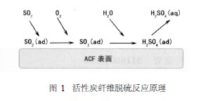 基于活(huo)(huo)性炭(tan)(tan)纖(xian)(xian)維具(ju)有常規活(huo)(huo)性炭(tan)(tan)無法(fa)比(bi)擬的吸附性能(neng),用于SO2 脫(tuo)除具(ju)有廣闊的應用前(qian)景。活(huo)(huo)性炭(tan)(tan)纖(xian)(xian)維應用于煙道氣(qi)(qi)中(zhong)(zhong)連(lian)續脫(tuo)除SO2 的反應原理見圖1[ 9 ] 。SO2 在(zai)活(huo)(huo)性炭(tan)(tan)纖(xian)(xian)維上吸附后(hou),在(zai)氧氣(qi)(qi)存在(zai)下被催(cui)化(hua)氧化(hua)為SO3 , SO3 再(zai)與煙氣(qi)(qi)中(zhong)(zhong)的水蒸(zheng)汽作用形成硫(liu)酸(suan),后(hou)者被活(huo)(huo)性炭(tan)(tan)纖(xian)(xian)維上冷凝的過量水洗脫(tuo),從而(er)空出SO2 吸附部位(wei),使SO2 的吸附、氧化(hua)水合及硫(liu)酸(suan)解(jie)吸等循環連(lian)續不斷地進行下去,這樣既(ji)可(ke)(ke)以(yi)避免(mian)炭(tan)(tan)材料(liao)由于磨損或再(zai)生(sheng)導致的損耗(hao)及活(huo)(huo)性下降,也可(ke)(ke)以(yi)避免(mian)對炭(tan)(tan)材料(liao)的頻繁(fan)再(zai)生(sheng),從而(er)降低了操作運行成本。