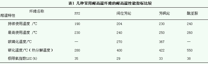 目前國內在評價濾料用纖維阻燃性能指標時,主要側重于纖維的持續工作溫度、最高使用溫度、碳化溫度、極限氧指數LOI等指標,表1列出了目前常用的幾種高溫濾料用纖維的耐溫特性指標的比較[4-6]。