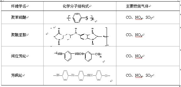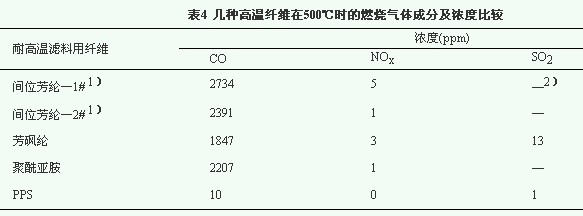 耐高溫有機合成纖維的碳化溫度一般都在400℃以上,表4列出了幾種耐高溫纖維在加熱到500℃時,產生的燃燒氣體的成分和及其含量。