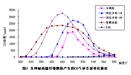 另外不同纖維CO分解的起始溫度也不相同,最先分解的為聚酰亞胺和間位芳綸-2#纖維,約在330℃;間位芳綸-1#和芳砜綸纖維分解溫度出現在440℃左右;PPS纖維則在550℃高溫后才開始產生CO。