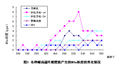間位芳綸-1#纖維和芳砜綸纖維在510℃左右達到了濃度峰值,而間位芳綸-2#纖維、聚酰亞胺纖維和PPS纖維的NOx濃度最大值有曲線變化趨勢看,應該出現在580℃或更高的溫度。