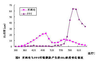 試驗的五種纖維樣品中,如表2中所列的各種纖維的化學分子結構式,由于芳砜綸和PPS纖維的分子主鏈上分別還有砜基和苯硫基,因此這兩種纖維燃燒氣體中還有SO2氣體。圖4為燃燒測試的芳砜綸與PPS纖維樣品燃燒產生的SO2濃度的變化情況。由曲線變化情況可明顯得,芳砜綸纖維在500℃時,燃燒產生的SO2氣體濃度達到最大值,為22ppm;而PPS在接近550℃時,SO2的含量才明顯上升,在600℃高溫時達到最大值,為64ppm。