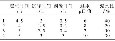 (2)實驗確定的最佳的實驗條件是:曝氣時間 4·5h,沉降時間2h,pH值7·0,泥水比為30%,閑置時間0·5h。