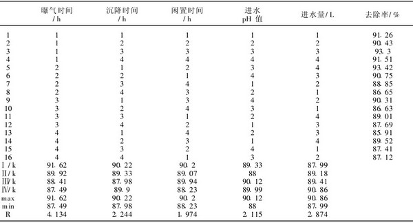 選取曝氣時間、沉降時間、進水量、pH值以及進水量五個影響因素,分別取四個水平進行正交實驗,因素水平見表1,正交實驗方案與結果見表2。