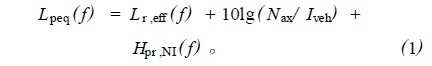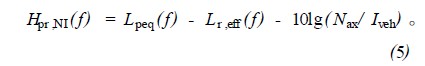 式中: f為1/3倍頻(pin)程頻(pin)率(lv)(Hz);Lpeq(f)為給(gei)定速度下(xia)等效(xiao)聲壓譜(dB-20uPa) ;Lr,eff(f) 為給(gei)定速度下(xia)等效(xiao)合成有(you)效(xiao)不平順度(頻(pin)率(lv)) 譜[dB-1μm];Nax為車(che)軸數;Iveh為車(che)長(m) ; Hpr,NI(f) 為有(you)效(xiao)不平順度對聲壓的轉換函(han)數(轉化為1軸/m[dB-20Pa/ m1/2]) 。