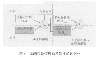 公式(shi)(1) 說明,若合成(cheng)有(you)效不平順度(du)、聲壓水(shui)平以及每米(mi)車(che)軸數(shu)已(yi)知,則轉(zhuan)換(huan)函數(shu)可(ke)以確定。而(er)聲壓可(ke)測得,合成(cheng)有(you)效不平順度(du)可(ke)由豎向鋼軌振動(dong)推(tui)求(qiu)。由于測得的聲壓包含了軌道(dao)噪聲和(he)(he)車(che)輛(主要指(zhi)車(che)輪) 噪聲2 部分(fen)(fen),為了對在(zai)高(gao)速運營條件下的輪軌滾動(dong)噪聲進行更詳細(xi)的描述和(he)(he)評價,可(ke)將兩者分(fen)(fen)開量化并考(kao)察,定義軌道(dao)轉(zhuan)換(huan)函數(shu)和(he)(he)車(che)輛轉(zhuan)換(huan)函數(shu),如圖4 所示。