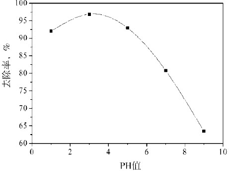 pH對苯酚去除率的影響見圖3所示。由圖3 可知,當初始pH為3時具有較高的去除率,當pH 值較高或較低時去除率明顯下降。分析原因認為當pH較高時, Fe ( II)會被氧化成Fe ( Ⅲ)形成Fe (OH) 3,導致Fe ( II)濃度降低,限制了芬頓反應的發生。從而降低去除效果。