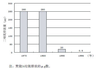 德國垃圾焚燒廠二惡英排放量從1970年的250μg/t下降至1996年的0.5μg/t(見下圖)。