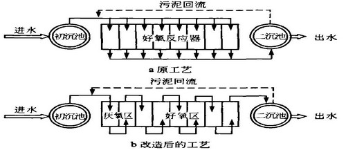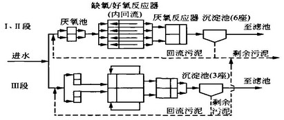 經過試驗研究,將原有的8個(ge)曝氣(qi)池由并(bing)聯(lian)改為串(chuan)(chuan)聯(lian),而且在(zai)整個(ge)反應(ying)器的前1/4區域增(zeng)設厭氧區,以(yi)獲得生物除磷的效(xiao)果(guo)。原并(bing)聯(lian)流(liu)程和改造后的串(chuan)(chuan)聯(lian)流(liu)程示意見(jian)圖2。