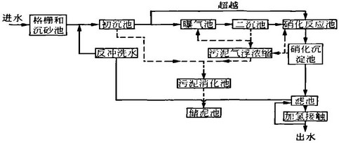 污(wu)(wu)水(shui)處理廠在1978年時(shi)對原有的(de)二(er)級(ji)處理工(gong)藝(yi)進(jin)行(xing)改(gai)造,增加(jia)了脫氮除(chu)磷處理工(gong)藝(yi),包括(kuo)硝(xiao)(xiao)化(hua)反應池(chi)、硝(xiao)(xiao)化(hua)沉(chen)淀(dian)池(chi)、濾(lv)池(chi)和(he)加(jia)氯(lv)消(xiao)毒等設施。污(wu)(wu)水(shui)處理的(de)工(gong)藝(yi)流(liu)程包括(kuo)進(jin)水(shui)格柵、沉(chen)砂池(chi)、初沉(chen)池(chi)、普通曝(pu)氣(qi)活性污(wu)(wu)泥系(xi)統(tong)(曝(pu)氣(qi)池(chi)和(he)二(er)沉(chen)池(chi))、硝(xiao)(xiao)化(hua)懸浮生長系(xi)統(tong)(硝(xiao)(xiao)化(hua)反應池(chi)和(he)硝(xiao)(xiao)化(hua)沉(chen)淀(dian)池(chi))、過(guo)濾(lv)進(jin)水(shui)二(er)次提(ti)升、顆粒填料濾(lv)池(chi)、加(jia)氯(lv)消(xiao)毒/除(chu)氯(lv)、后(hou)曝(pu)氣(qi),最后(hou)出水(shui)排(pai)人舊金山南(nan)部海灣。生物處理產生的(de)剩余污(wu)(wu)泥經氣(qi)浮濃縮后(hou)與初沉(chen)污(wu)(wu)泥進(jin)行(xing)厭氧消(xiao)化(hua),消(xiao)化(hua)后(hou)的(de)污(wu)(wu)泥在污(wu)(wu)泥儲(chu)存池(chi)存放。工(gong)藝(yi)流(liu)程見圖5。
