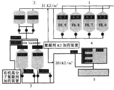 (4)污泥儲罐:儲存濃縮后的污泥,通過污泥泵提升至污泥脫水前儲罐(一座,容積1000m3)。提升過程中,在管線中加入混凝劑K2,劑量為20L/m3污泥,以提高污泥的可脫水性能。