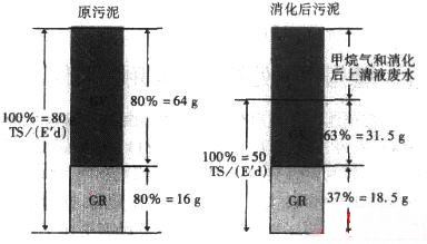 由圖3可知,在每個居民每天產生的80g原污泥中80%為有機物,20%為無機物;消化后剩下的固體物質50g,其中有機物占63%,無機物占37%。進污泥消化罐的原生污泥有機物的量為8.7t/d,再生污泥中有機物的量為6.59t/d,總共進行消化的污泥有機物的量為15.29t/d(GVo)。