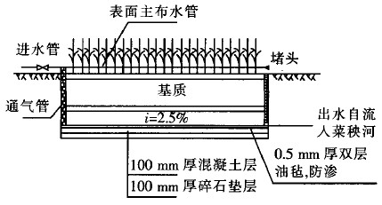 試驗在大理州巍山縣興巍民族工藝廠內進行。 垂直潛流人工濕地由磚和水泥砌成,用隔墻分為4 格,從南至北依次種植蘆葦、水芹菜、菖蒲和美人蕉, 種植密度均為9株/m 。每塊濕地的平面尺寸均為 3 m X 12 m,有效高度為1 In,池底坡度為2.5%。 人工濕地內的基質分為4層:第一層為表層,填 充100 mm厚、粒徑為8~16 mm的礫石,其作用是 防止砂層表面沖蝕;第二層為過濾層,填充500 mm 厚、粒徑為0.2~6 mm 的無泥粗砂,其作用是進行 生化處理;第三層為過渡層,填充100 mm厚、粒徑 為4~8 mm的礫石,其作用是防止上層砂粒堵塞下 排水層;第四層為排水層,填充300 mm厚、粒徑為8 ~ 16 mm的礫石,其作用是匯集并排出已處理的廢 水。濕地底部鋪0.5 mm的PE膜雙面土工布,防止 廢水滲透地下。人工濕地構造見圖2。