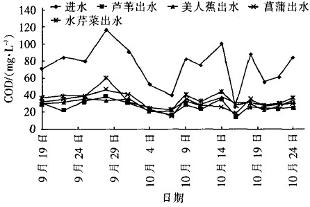 4種不同植物的垂直潛流人工濕地系統對COD 的去除效果見圖3。