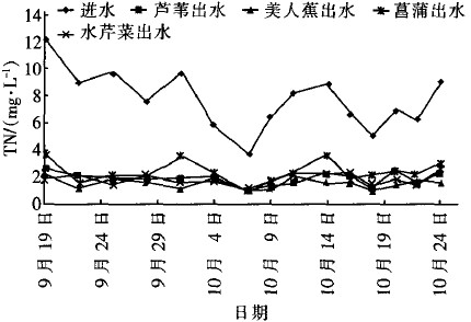 從圖4可知,在進水TN濃度相同的情況下,美人蕉人工濕地的出水TN平均濃度最低,僅為4.25 mg/L;菖蒲人工濕地的出水TN平均濃度最高,達到 5.3 mg/L。從對TN的去除率來看,4種不同的人工 濕地系統對TN的去除效果差別較大,其中美人蕉 和水芹菜濕地系統對TN的去除效果較好,去除率 均達到47%以上,蘆葦系統對TN的平均去除率為 41.27% ,而菖蒲系統對TN的去除效果相對較差, 去除率僅為37.97% 。