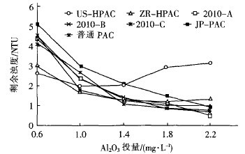 為了適應國內對高純、高濃但價格不高的PAC 的市場需求,深圳中潤公司推出了“2010A、B、C”系列PAC新產品,其毒理指標達到歐美PAC同等水平,但混凝效果(同等氧化鋁)高于歐美PAC約 30% ,售價(同等氧化鋁)僅為歐美PAC的20% ~ 30% 。以深圳水庫原水(濁度為32.2 NTU,pH= 6.95,水溫為27℃ ,GT值為25 182)為例,對us— HPAC、JP—PAC與中潤公司產品(ZR—HPAC、2010 -A、2010-B、2010-C)的混凝效果進行比較,結果見圖1。