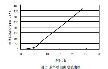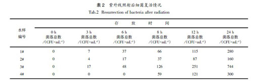 為(wei)了(le)研究紫外(wai)(wai)線(xian)消(xiao)毒的(de)持(chi)續性,我們進行(xing)了(le)紫外(wai)(wai)線(xian)照射后細菌復活(huo)試(shi)驗(yan)。試(shi)驗(yan)分為(wei)四(si)組平行(xing)試(shi)驗(yan),一(yi)天取一(yi)組樣,每組都是(shi)經過20 W的(de)紫外(wai)(wai)線(xian)燈管(guan)照射(照射時(shi)間(jian)2.89 s,劑量2 225 μW.s /cm2)后取樣放在(zai)化驗(yan)室中培(pei)養檢測。其復活(huo)情(qing)況見表2。