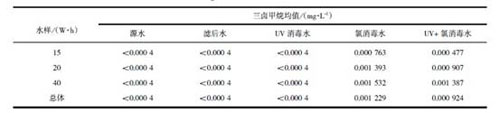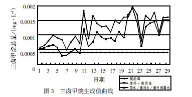 由于三(san)鹵(lu)甲烷(wan)具有(you)三(san)致(zhi)性(xing),對人類(lei)的健康十(shi)分(fen)(fen)有(you)害,而(er)且也是現行(xing)氯消毒工藝(yi)的主要(yao)副產物,為此,對三(san)鹵(lu)甲烷(wan)在各處(chu)理工藝(yi)進出水(shui)中的變化結果進行(xing)了取(qu)樣分(fen)(fen)析(xi),各工藝(yi)流程源(yuan)水(shui)和(he)消毒出水(shui)中三(san)鹵(lu)甲烷(wan)的檢測數據見圖3 和(he)表3。
