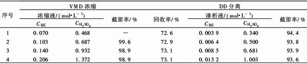 集成膜法回收硫酸稀土溶液中硫酸,系指先采 用減壓膜蒸餾濃縮低濃度的硫酸稀土溶液,再采用 擴散滲析法處理濃縮液以回收其中硫酸,其中擴散 滲析的料液為減壓膜蒸餾濃縮硫酸稀土溶液的濃縮 液.由于擴散滲析處理的是濃縮液,較之單獨采用擴 散滲析法回收硫酸稀土溶液中的硫酸,處理量大大 減小,設備的一次性投資因此降低,而且回收得到的 硫酸濃度增大.表為經減壓膜蒸餾濃縮不同程度 的硫酸稀土溶液,再經擴散滲析的實驗結果.實驗固 定條件,料液成分:CRE=0.070 mol/L,CH2SO4= 0·468 mol/L,減壓膜蒸餾濃縮時,溫度60℃,料液 流速5.8 cm/s,減壓側壓力12.7 kPa;擴散滲析操 作方式為一次通過式,料液流量150 mL/h左右,流 量比1.0左右,溫度28~29℃,滲析料液為減壓膜 蒸餾濃縮過程所得的濃縮液.