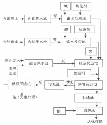 4.綜(zong)(zong)合(he)反應池。經氧化反應的含氰廢水(shui)、還原反應的含鉻廢水(shui)以及綜(zong)(zong)合(he)廢水(shui)集中(zhong)于(yu)此進行中(zhong)和反應。