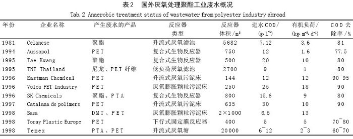日本東麗工業向聚酯生產廢水中加入堿性化合物,使廢水中乙醛轉化為其他化合物,從而減少廢水中乙醛含量。國外聚酯企業20世紀80年代以來的聚酯工業生產廢水處理概況見表2。