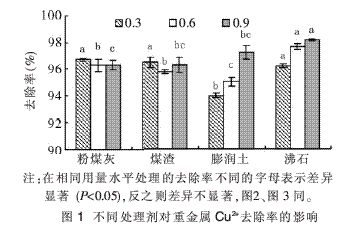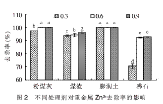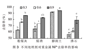 本研究結果表明,在相同的用量水平下,粉煤灰、煤渣、沸石對Cu2+、Zn2+、 Ni2+的去除效果均存在差異,具體表現為:粉煤灰對Zn2+的去除效果最好,Cu2+的次之,Ni2+的最差;煤渣對Cu2+和Zn2+的去除效果相近,且都優于對Ni2+的去除效果;沸石Cu2+的去除效果最好,Zn2+的次之,Ni2+的最差。膨潤土對3種重金屬離子的去除效果無顯著差異,且相對其他處理劑較好,去除率均達91.5%以上;4種處理劑中,沸石對Cu2+的處理效果最好,膨潤土對Zn2+和Ni2+的處理能力最好,粉煤灰和煤渣的處理能力為兩者之間。