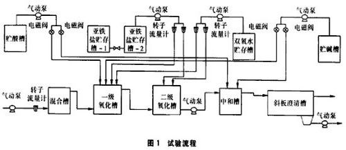 中試流程如圖1所示。其中氣動泵所需氣壓由位于拖車下面的兩臺空壓機提供,一級氧化槽和中和槽內的pH值由pH控制儀控制,分別為3.5和8.0,調節pH值所需的酸堿分別為98%硫酸和25%氫氧化鈉溶液。小試的結果表明,當pH值在2~3.5之間時Fenton法的處理效果最佳,所以設計時一級和二級氧化槽內的pH值分別控制在3.0左右。試驗發現當一級氧化槽內的pH值穩定在3.5左右時,二級氧化槽內的pH值接近于3。因此為節省調節pH值所需堿的用量,實際操作時僅控制一級氧化槽內的pH值。另外,無論采用單級氧化或是二級氧化方式時,混合槽中只有滲濾液流過,并沒有將滲濾液和亞鐵鹽在槽內混合。